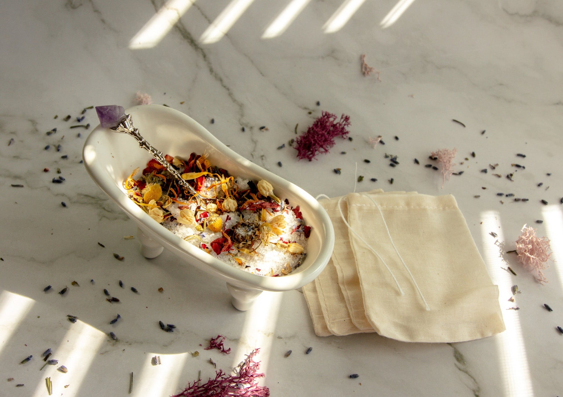 - Deluxe Ritual Kit – Includes a refill-sized bag of our herbal bath tea, four reusable muslin tea bags, and a unique antique-style tea spoon adorned with a crystal—perfect for an elevated bath ritual experience.